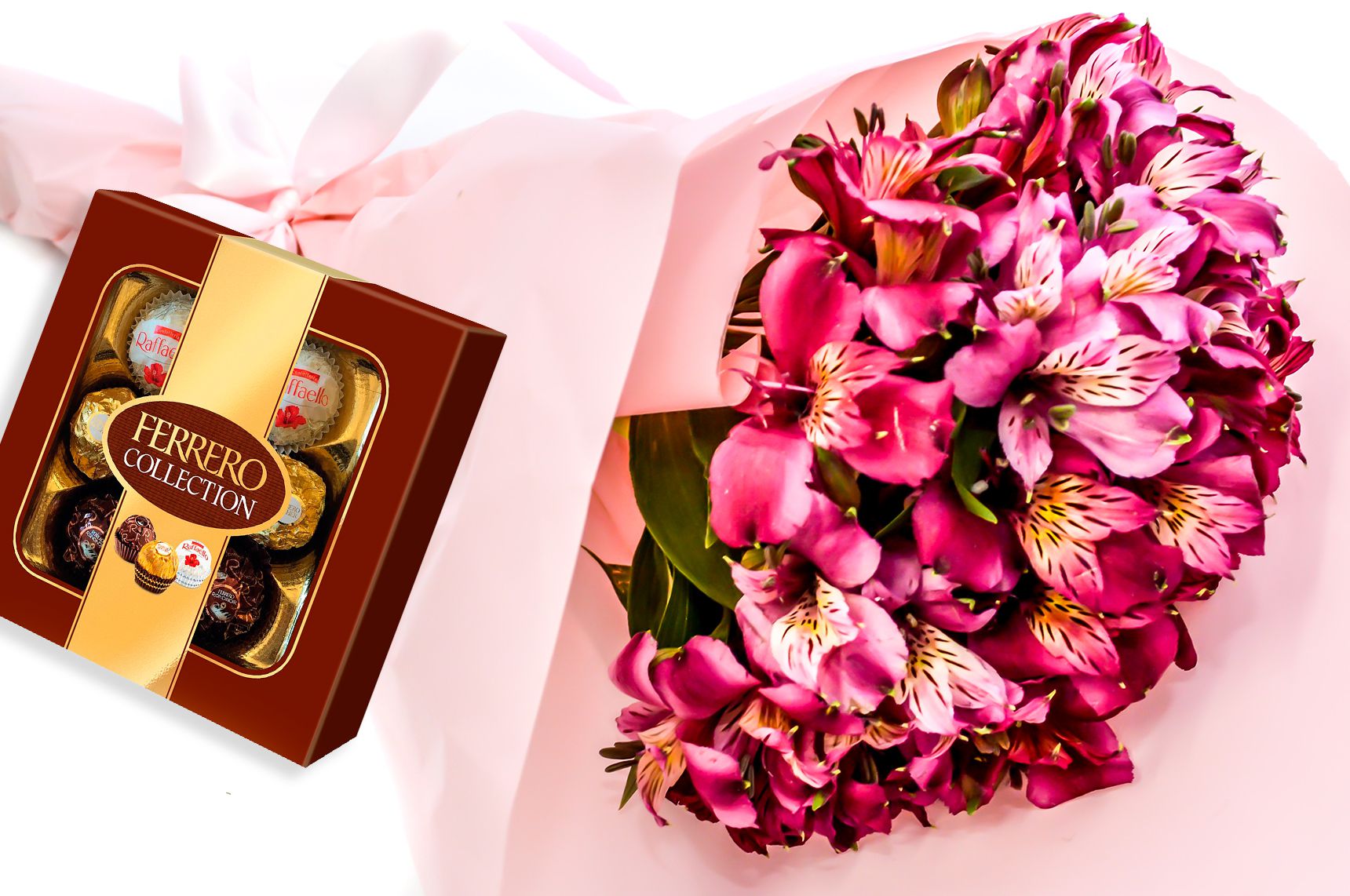 Kit Buquê Romance de Astromélias Rosas + Ferrero Rocher